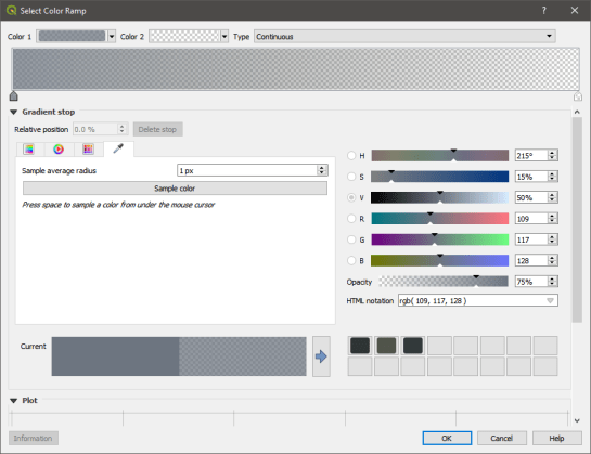 Change the Render type to Singleband Pseudocolor and use 0 and 3000 for the min and max values (limiting maximum latitude of the mist to 3000 meters). Then open the colour ramp window by clicking on the Color ramp and enter these values: